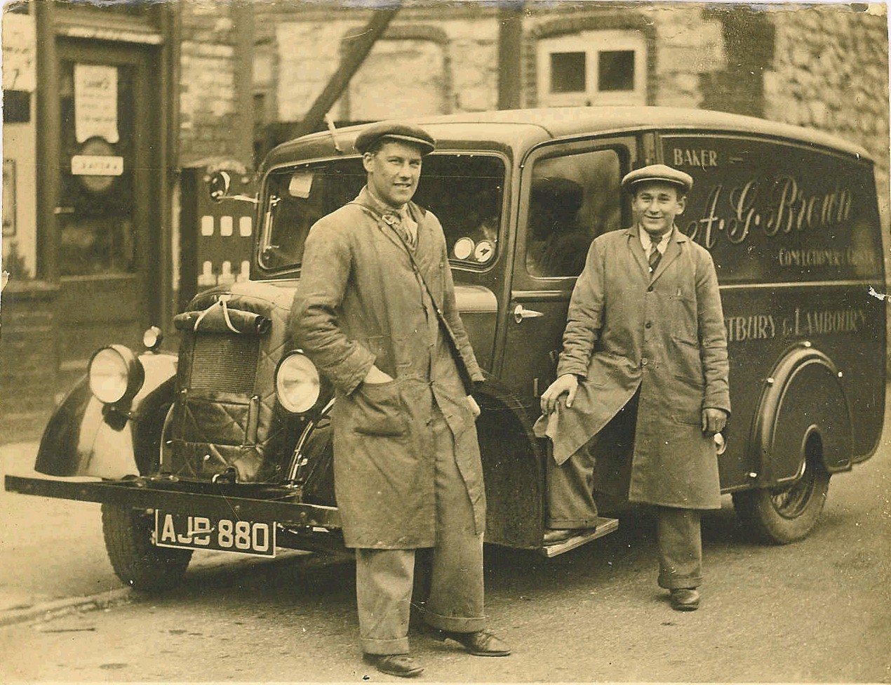 DB014: Bob Powell and Charlie Brown, with delivery van, Lambourn, 1930s