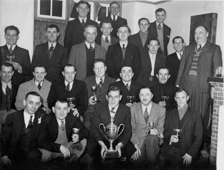 | Notes | Back row, l to r: ?, ?, ?, ?, Henry Pontin; 2nd from back: Howard Rodbourne, ?, Ted Pontin, ?, Tony Moony, Alf Wilder, Landlord; 3rd from back: Jock Whitingham, Speedy Lawson, ?, ?, ?, Steve Gullius; Front: Mac McLean, ?, Cecil Pike, Monty Doggett, ? |